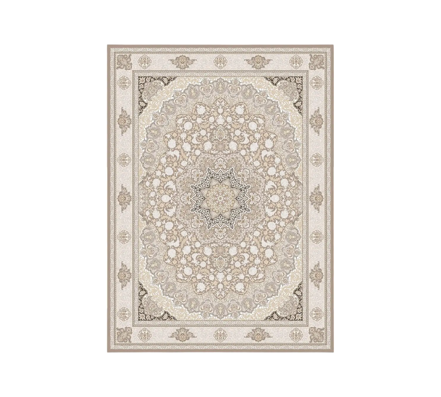 درست در مرکز، یک ترنج (مدالیون) بزرگ و باوقار قرار گرفته است. این ترنج، مانند حوض اصلی در یک حیاط ایرانی، نقطه کانونی فضا است. تمام نگاهها ناخودآگاه به سمت آن کشیده میشود. نقوش پیچیده و ظریف درون آن، شما را به کشف جزئیات دعوت میکند و به فضا عمق و شخصیت میبخشد. این مرکزیت قدرتمند، به چیدمان مبلمان شما نظم میدهد و یک نقطه اتکای بصری ایجاد میکند.