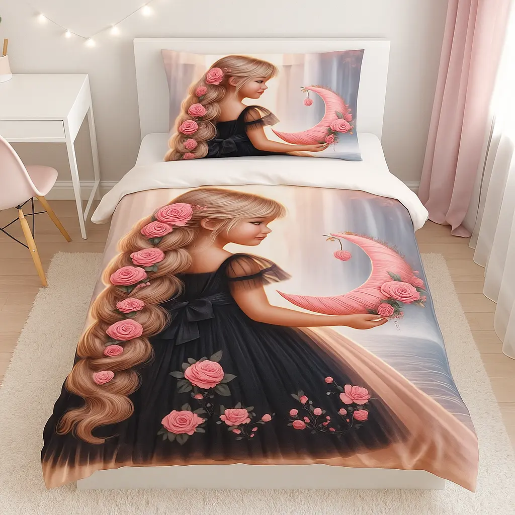 در سرزمینی دور، جایی که دریا به آسمان میرسید، پرنسسی به نام «لونا» زندگی میکرد. موهای او به رنگ نور ستارهها بود و با هر طلوع خورشید، یک گل رز جدید در میان گیسوانش میشکفت. لونا یک دوست داشت: ماه. هر شب، ماه از آسمان پایین میآمد و در دستان لونا آرام میگرفت تا برای او از داستانهای کهکشانها بگوید. این روتختی، تصویر همان لحظه جادویی است؛ لحظهای که پرنسس و ماه، رازهایشان را با هم در میان میگذارند.