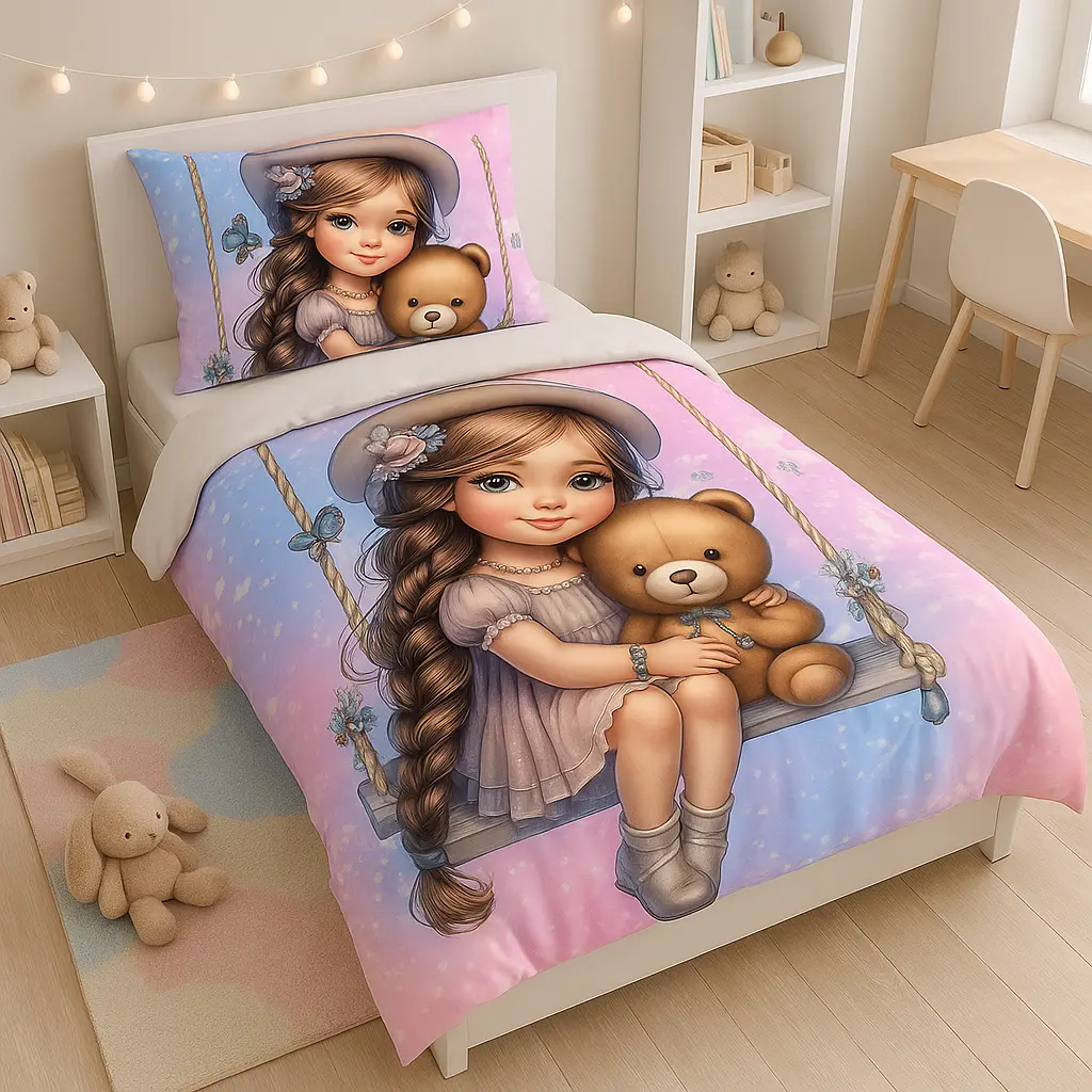 - طرح دخترانه و رؤیایی: روتختی تک نفره با طرح سهبعدی دختر و خرس روی تاب.