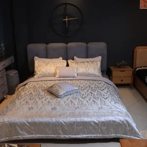 - جزئیات یک محصول کامل: این ست شامل یک روتختی بزرگ به ابعاد ۱.۵۰ × ۲.۴۰ متر است که به زیبایی تشکهای استاندارد یک نفره را میپوشاند. روبالشتی آن نیز با سایز استاندارد ۵۰ × ۷۰ سانتیمتر، این طراحی شیک را کامل میکند. لایه زیری روتختی نیز با رنگ قهوهای تیره کار شده که با دکورهای چوبی و مدرن، هماهنگی بینظیری دارد.